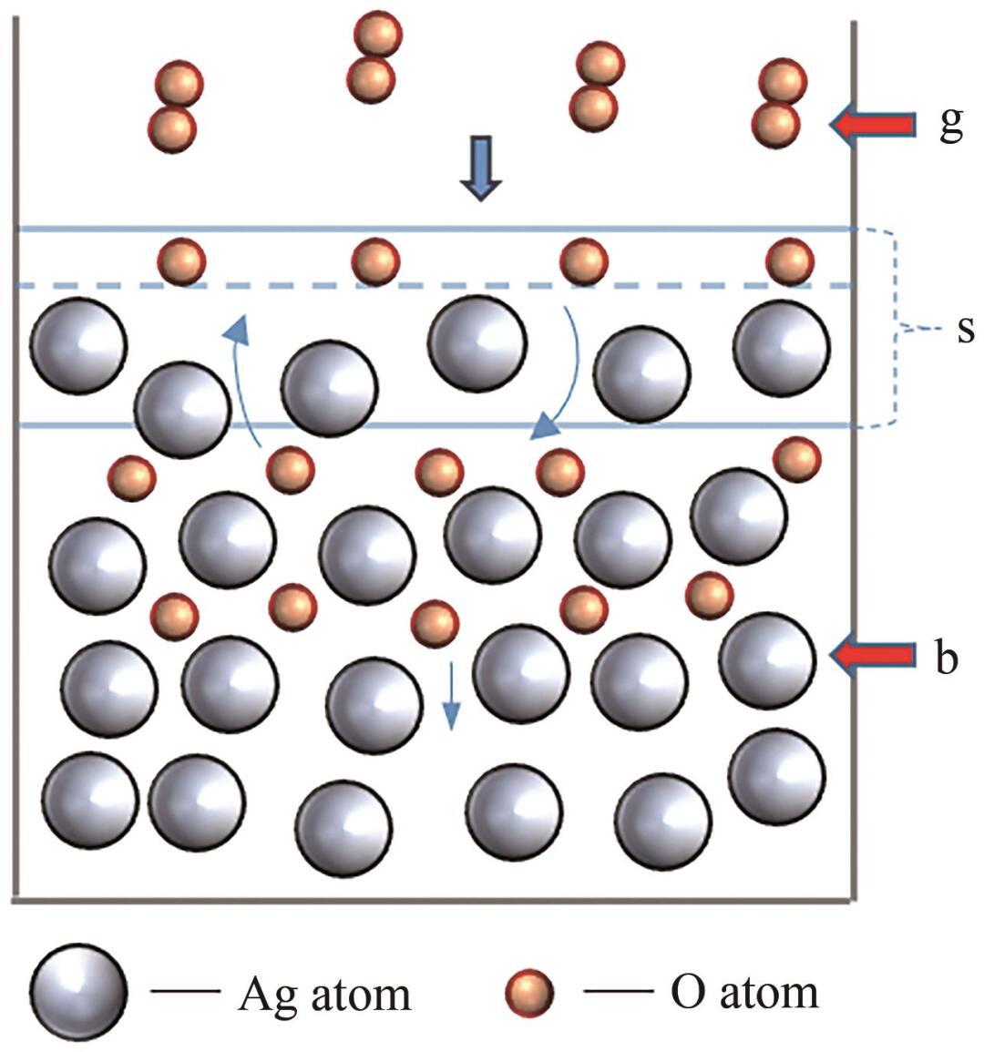 根据图1,首先O2分子从气相(g)扩散至表面相(s);其次在Ag的催化下解离为O原子,并发生化学吸附;最后,O原子从表面相(s)扩散至本体相(b)。整个过程可以表示为: