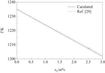 根据式(23)计算了Ag-O系的液相线,结果如图2所示。从图中可以观察到,理想溶体近似模型的计算值与实验相图[29]非常吻合。因此,可以将Ag-O系视为理想溶体。