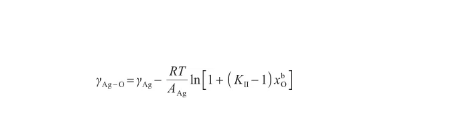 由式(12)和(13)可以看出,Butler方程计算较为复杂。考虑液态氧的表面张力很小[14],可以认为γO≈0。另外,由于Ag-O系中O原子数远小于Ag原子数[29],可以将Ag-O溶体视为理想溶体。此时,GE,b=G=G=0。根据文献[18],当式(12)所示的Butler方程用于描述理想溶液时,通过假设系统内两组分具有相等的摩尔表面积,可以得到改进的Butler方程。这个改进的Bulter方程能够推导出Gibbs吸附方程和Langmuir方程,被认为是表面张力和溶液吸附的根本方程。因此,令AAg=AO,将式(12)变换为: