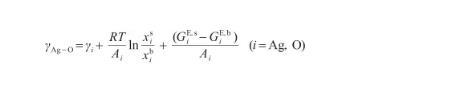 式中,γAg-O表示Ag-O系的表面张力(N/m),γi表示纯组分i的表面张力(N/m),R为气体常数[J/(mol·K)],x和x分别表示组分i在表面相和本体相中的摩尔分数(mol/mol),Ai为组分i的摩尔表面积(m2/mol),G和G分别表示表面相和本体相中组分i的偏摩尔过剩自由能(J/mol),并且G=λG,其中λ为表面相和本体相的原子配位数之比[27]。G可由摩尔过剩自由能GE,b表示,其关系式为: