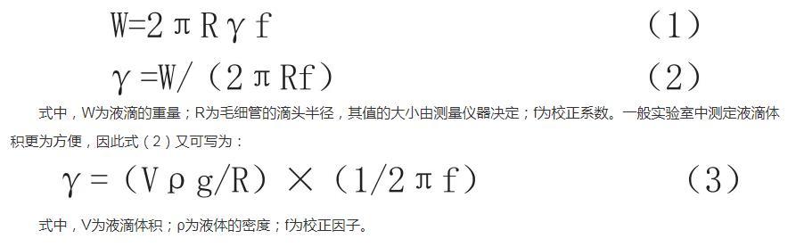 滴体积法的基本原理是这样的,利用毛细管滴头,缓慢往下滴液体,这时候测量液滴的大小,就能测定液体的表面张力。这是因为液体的表面张力,与从毛细管滴下的液滴的大小有内在关联,存在正比关系,这个关系可以用数学公式表达: