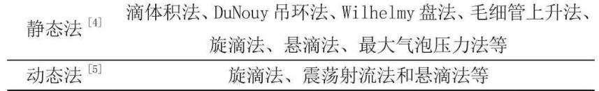 液体表面张力可以通过仪器测定,目前测定方法大体上分为动态法和静态法。这两大类方法下面由于细分,具体分类如表1。