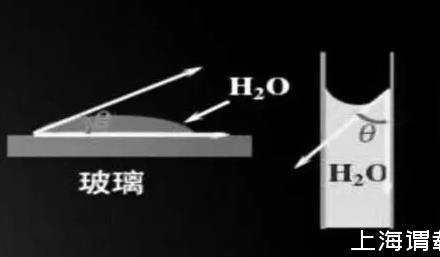 在实际工作中,通常会用到接触角结合γg-l气-液界面张力来判断铺展过程是否自动进行。接触角,是指在固相、液相、气相这三相的交界点,两个界面张力(气-固界面与气-液界面)之间的夹角,通常用θ表示。如图1,将水滴滴到玻璃上,接触角如图所示。