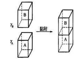 第一种方式,黏附方式。两种不同的液体,液体A和液体B,互相相接触后,两者和气体形成的表面同时消失,形成液体A和液体B之间的界面,也就是液液界面(AB)的过程,这就是黏附过程。该过程如图2所示。