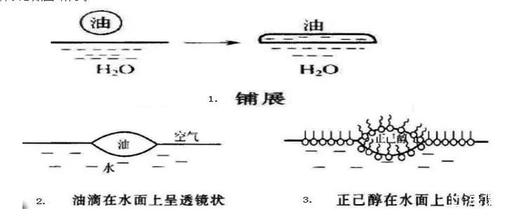 第二种方式,铺展方式。在上述的液-固界面的润湿作用,液体在固体表面的铺展也可以引用到液液界面,不过此时的铺展过程复杂一些。比如在清洁的水面上,滴加不溶性“油”滴,此时的“油”在水面上,可能表现出三种不同的状态: