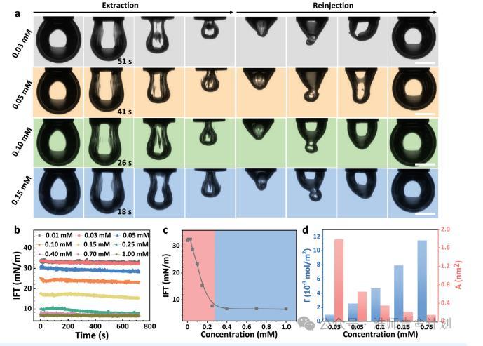 首先,在GL和SSD共组装之前,用垂滴张力法研究了GL在水-甲苯中的界面行为。如图1a所示,当提取浓度为0.03、0.05、0.10和0.15 mM的甲苯中GL水溶液的液滴时,分别在51、41、26和18 s时,液滴界面面积减小,在液滴界面上出现了明显的起皱。同样,当液滴完全虹吸到针管中并重新注入到初始体积时,起皱现象重新出现,液滴由不规则逐渐扩大到规则。抽注过程中起皱现象的出现,有力地揭示了水-甲苯界面处弹性膜的形成。图1b测量了GL溶液和甲苯之间的时间分辨界面张力(IFT)。当GL浓度<0.03 mM时,甲苯与GL溶液之间的界面张力近似等于纯水与甲苯之间的界面张力(≈32 mN·m−1)。随着GL溶液浓度从0.03增加到0.25 mN·m−1,界面张力下降到6.8 mN·m−1,而从0.25到1.00 mM,界面张力保持在6.8 mN·m−1不变当GL浓度<0.03 mM时,甲苯与GL溶液之间的界面张力近似等于纯水与甲苯之间的界面张力(≈32 mN·m−1)。随着GL溶液浓度从0.03增加到0.25 mM,界面张力下降到6.8 mN·m−1,而从0.25到1.00 mM,界面张力保持在6.8 mN·m−1不变。据此,确定0.25 mM为GL分子在水-甲苯界面处的临界胶束浓度(CMC)(图1c)。这意味着液滴在GL的CMC以下会发生收缩,而在CMC以上液滴会发生起皱。为了进一步解释这一现象,蜜桃性爱视频网站计算了不同浓度下GL分子的界面吸附容量和截面积。图1d蜜桃性爱视频网站可以看到GL的界面吸附量随浓度的增加成比例增加,相反,随着浓度的增加,横截面积减小。综上所述,GL是一种特殊的两亲分子,可以在油水界面形成界面膜。