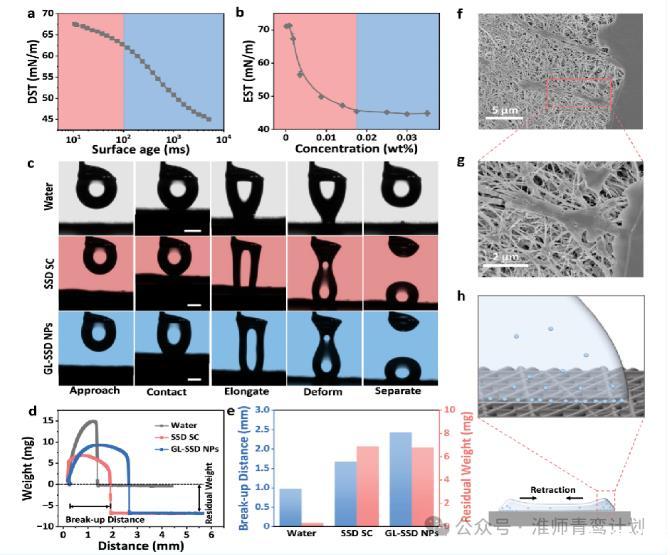 然后,作者研究了GL-SSD NPs液滴在疏水表面的沉积机理。先是测量了GL-SSD NPs溶液的动态表面张力(DST)和粘度。DST结果显示,GL-SSD NPs溶液在前100 ms内发生轻微变化,这意味着GL-SSD NPs的扩散速率较慢,EST值随着浓度从0到0.018 wt%的增加而减小到45 mN m−1,而当浓度高于0.018 wt%时,EST值保持不变。因此,0.018 wt%作为GL-SSD NPs的临界胶束浓度(CMC)清楚地观察到接近、接触、伸长、变形和分离的顺序过程。从PTFE表面分离后,水滴从表面被彻底清除,没有留下任何残留物,而SSD SC和GL-SSD NPs液滴在中间发生了明显的伸长和断裂,在表面保留了大量的液体。水、SSD SC和GL-SSD NPs的残余质量分别为0.35、6.9和6.8 mg,而GL-SSD NPs溶液的破裂距离为2.43 mm,远高于水和SSD SC的0.97 mm和1.68 mm,表明GLSSD NPs与PTFE表面的相互作用最强。此外,扫描电镜(SEM)图像显示,撞击后的缩回轨迹中留下了大量的液滴残留物。在液滴撞击过程中,大量GL-SSD NPs在三线处的沉积会利用PTFE表面固有的亲水性改变其润湿性,产生固定点,延缓液滴缩回。