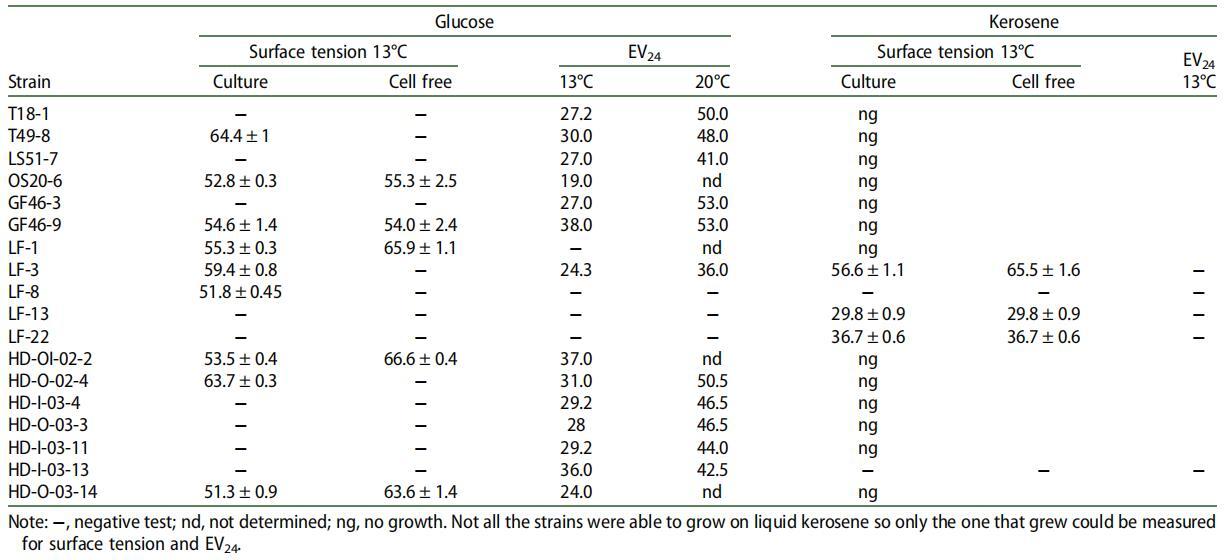 表 1. 在葡萄糖和煤油上生长的细菌菌株的培养物和培养物滤液的表面张力和乳化值。