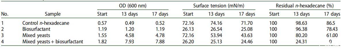 表 4. 正十六烷生物降解试验中的细菌生长、表面张力和正十六烷残留量(结果为两次重复的平均值)。