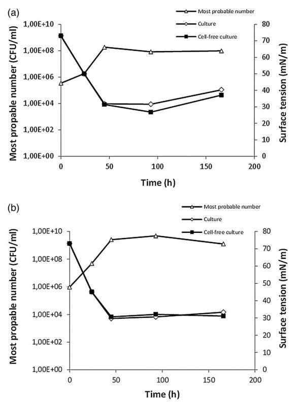 菌株红球菌属。 菌株 LF-13 和红球菌属。 大约 2 天后,菌株 LF-22 达到稳定期(图 1)。 LF-13 和 LF-22 的培养物表面张力的最低值分别为 31.8 和 29.3 mN m-1,当培养物达到稳定期时(图 1)。 无细胞制剂的值显示出与培养物类似的降低,表明生物表面活性剂被释放到培养基中。 从工业角度来看,将生物表面活性剂分泌到培养基中的分离物很有趣,因为这使得生物表面活性剂的纯化过程更简单。 [16,44,45]