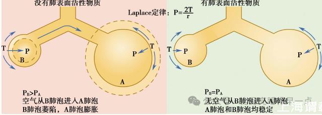 由上述公式可知,在T相同的情况下,肺泡半径r越大,则肺泡液气界面的压强越小;肺泡半径r越小,则肺泡内液-气界面的压强越大。