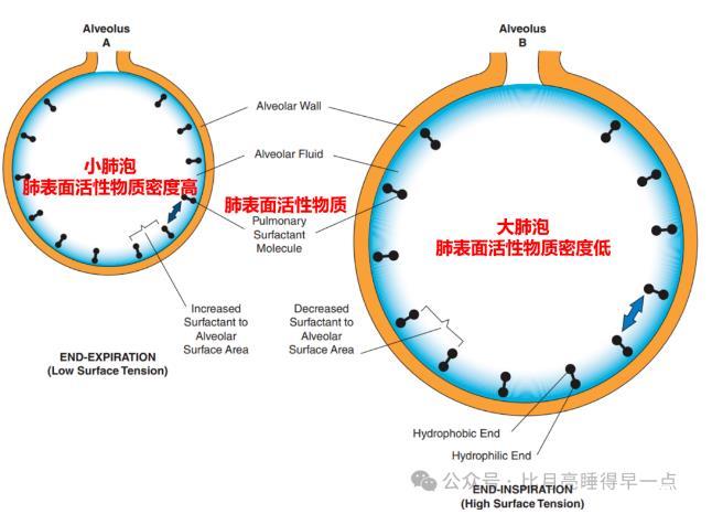 然而,机体并不会出现上述情况,这主要是由于小肺泡的肺表面活性物质分布密度大于大肺泡,故在r小的同时,T也小,因此大小肺泡的肺泡液-气界面的压强基本相同。见图3。