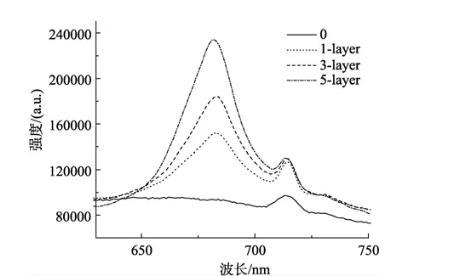 图4是石莼类囊体膜LB膜在纳米ZnO上的室温荧光发射光谱,类囊体膜的最大荧光发射峰在683 nm,随着类囊体膜在ZnO上吸附层数的增加荧光发射强度增大。菠菜类囊体膜的荧光发射光谱表现出相同的趋势(结果未显示)。