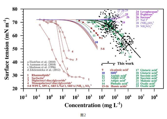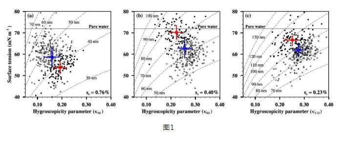 大气气溶胶作为云凝结核,通过与云的相互作用对气候产生影响。气溶胶活化为云滴,除了取决于气溶胶的粒径大小、化学成分和混合状态,更进一步地,与气溶胶的表面张力息息相关。大气气溶胶和云滴中广泛存在着具有表面活性的有机物,它们可以减小气溶胶活化时的表面张力,降低粒子增长的能量壁垒,使气溶胶更容易被活化为云滴,从而增加云滴数浓度。本次研究结果表明:有机物显著降低了污染大气中气溶胶的表面张力。