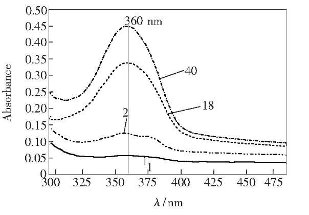 LB膜是在芬兰生产的KSV2000单槽制膜系统上制备而成的,制膜的亚相为20℃二次蒸馏去离子水。将化合物以氯仿为溶剂配置成1.023×10-4mol/L的溶液,用微量注射器铺展到亚相表面上。压膜速度为5 mm/min,在15 mN/m恒定表面压下采用水平附着法制备X型LB膜,基板为经疏水性处理的直径为15 mm的石英玻璃。吸收谱及稳态荧光谱的测量分别在日立U-3310型紫外-可见光谱仪和英国Edinburgh Instruments(EI)公司生产的FLS920型荧光光谱仪上完成,荧光光谱的激发光源为450 W氙灯。