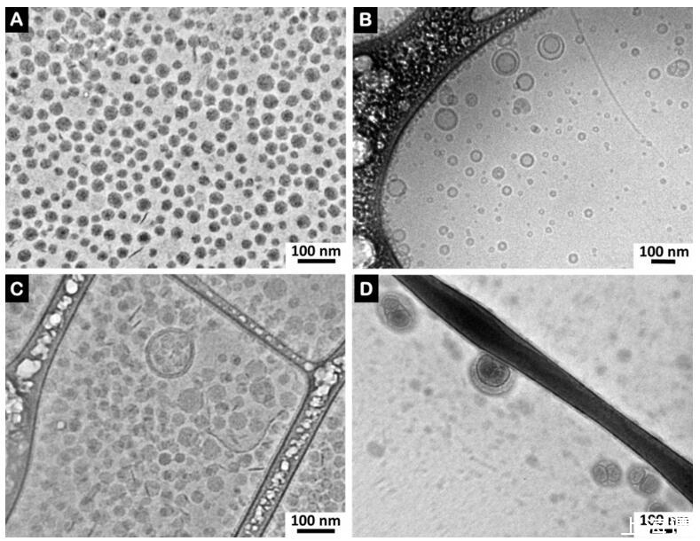 图 7. (A) LDLs、(B) 脂质体、(C) LDLs 和精浆(精浆中的比例为 0.17 mg PC/mg BSP 蛋白)和 (D) 脂质体和精浆的冷冻 TEM 图像 (精浆中 0.16 mg PC 脂质体/mg BSP 蛋白的比率)。