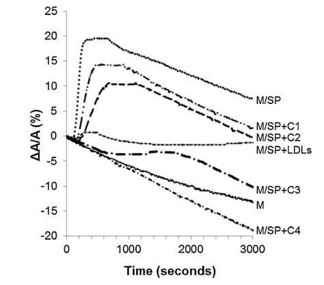 当低密度脂蛋白与牛精浆混合时 蛋白质重量比为 10:1 (BSP:LDLs) 并注射到单层下方,单层的分子面积随时间记录 几乎没有变化(曲线 M/SP + LDL,图 5)。 肩膀出现在 大约 400 s 揭示了 BSP 蛋白的弱吸附(这 肩部代表 M/SP 的 5%,上图曲线)。 然后,该 1000s后分子面积的变化减少并稳定。 不会像 M 和 M/SP 曲线的变化那样减少, 表明 LDLs 成分的吸附,与 它们在界面处的高扩散能力(曲线 M/LDL,图 4)。 因此,SP 中所含 BSP 蛋白在界面处的吸附 由于低密度脂蛋白而大大降低,并且 BSP/低密度脂蛋白的比率非常高 接近最佳值以完全防止 BSP 蛋白质影响单层。 磷脂酰胆碱注射量 根据低密度脂蛋白的组成估计为 4.61 毫克 [33]。 因此,注射了 4.61 mg LDLs 的磷脂酰胆碱 26.6mg精浆蛋白质,即1mg精浆蛋白质需要0.17mg磷脂酰胆碱。