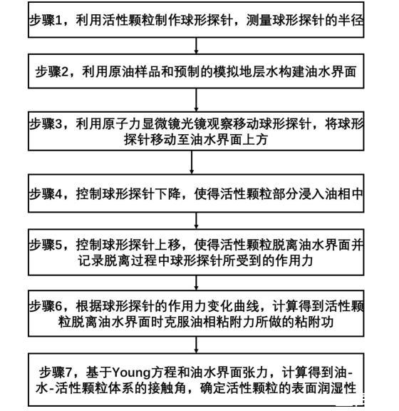 步骤7,利用界面张力仪测量油相与水相之间的界面张力,基于Young方程,结合球形探针的半径以及球形探针的下降高度,计算得到油-水-活性颗粒体系的接触角,确定活性颗粒的表面润湿性。