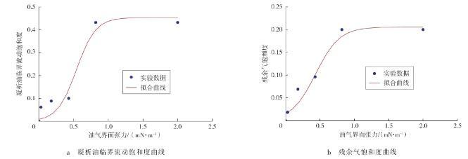 从图3和式(3)可知,界面张力对凝析油临界流动饱和度的影响分为2个阶段:早期随着界面张力增大,凝析油临界流动饱和度迅速增加,直到最大凝析油临界流动饱和度;之后,凝析油临界流动饱和度为常数,界面张力的影响较小。残余气饱和度与凝析油临界流动饱和度的变化特征类似。