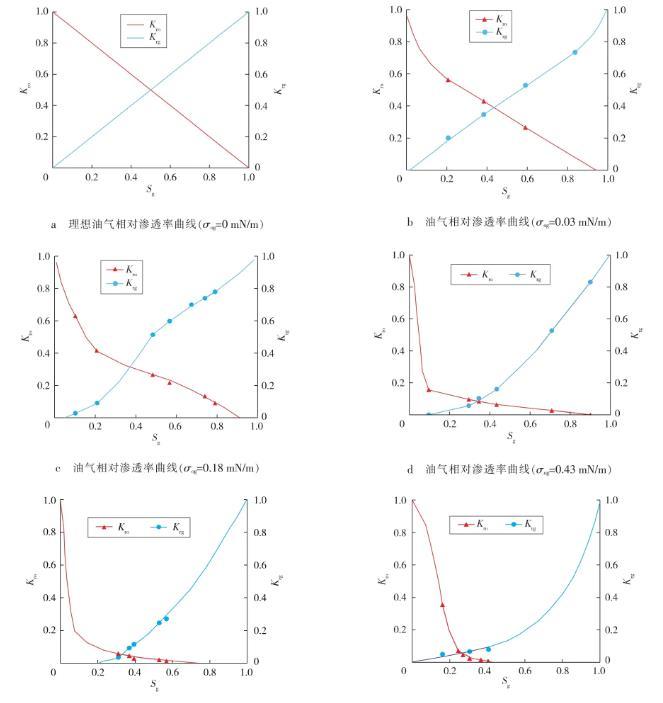 2)界面张力显著显著阶段。随着地层压力逐渐低于露点压力,界面张力逐渐增大,凝析油气相对渗透率曲线由直线逐渐变成曲线,并且曲率逐渐增大,凝析油临界流动饱和度和残余气饱和度也逐渐增大(见图2b—2d)。
