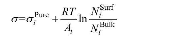 式中:σipure表示纯组元和Al2O3)的表面张力;Ai为纯组元i的摩尔表面积,其中L为校正因子,熔渣中设为1.091;N0为阿伏加德罗常数,Vi为组元i的摩尔体积);R和T分别表示摩尔气体常数和绝对温度;为组元i在表面相或体相的质量作用浓度。