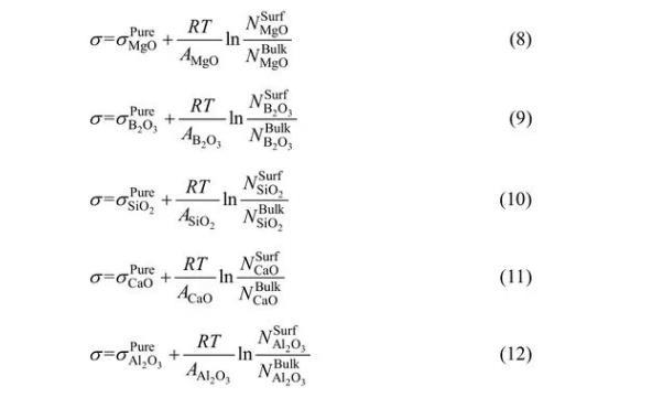 对于MgO-B2O3-SiO2-CaO-Al2O3体系,依据Bulter方程,其表面张力可以分别表示为