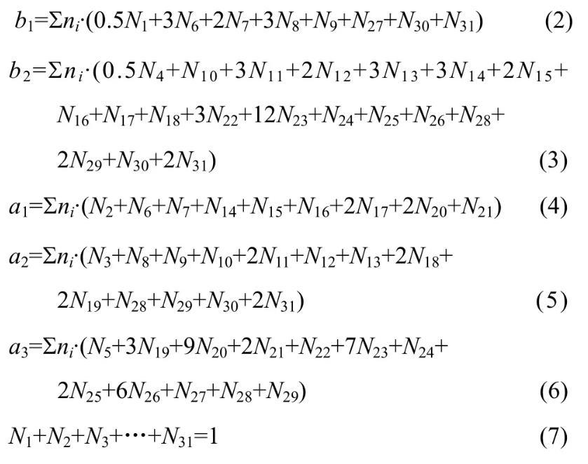 所有组元总平衡摩尔数表示为∑ni。各组元作用浓度表达式为:
