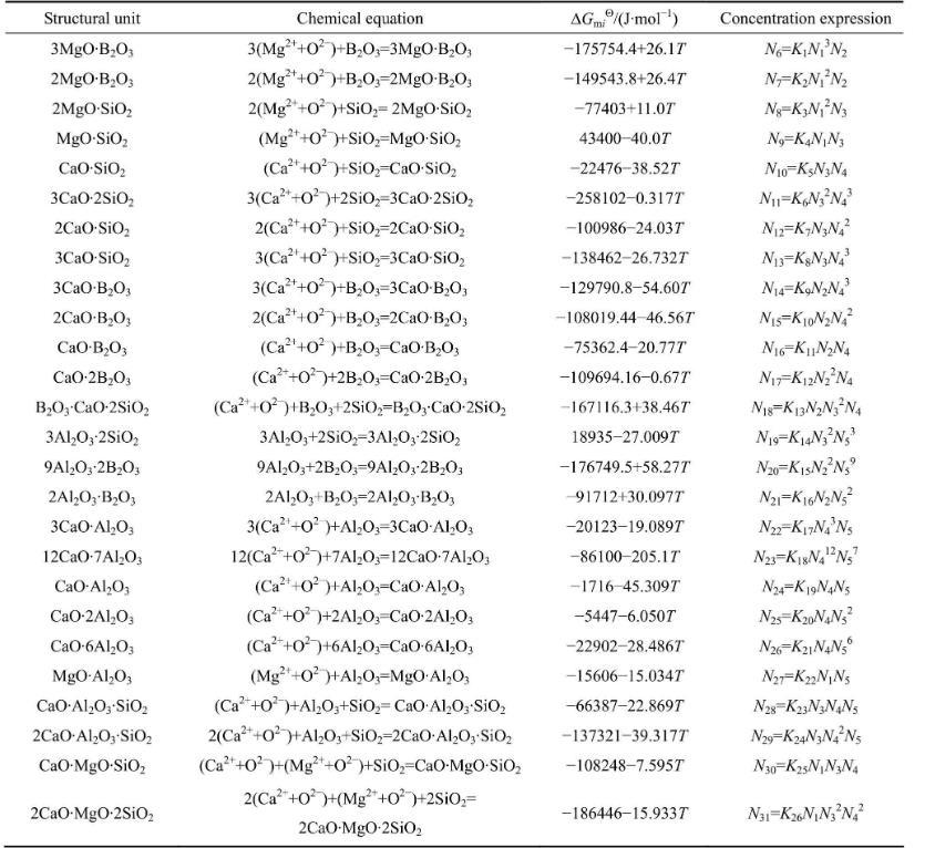 表1 MgO-B2O3-SiO2-CaO-Al2O3渣系中复杂分子的化学反应及标准Gibbs自由能和作用浓度的表达式