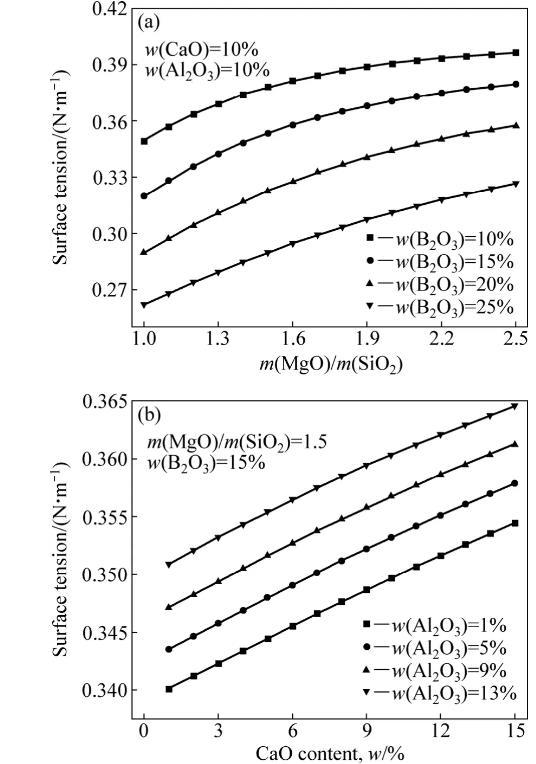 3.4 MgO-B2O3-SiO2-CaO-Al2O3体系中组分含量对熔渣表面张力的影响