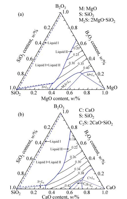 1873K时含B2O3三元体系等温相图及液相线如图4所示。实际条件下,Si常存在于金属相中,而SiO2则以硼硅酸盐的形式存在于熔渣中,因此,SiO2添加对含B2O3三元体系热力学性质的影响仍有待确定,MgO-B2O3-SiO2、CaO-B2O3-SiO2和Al2O3-B2O3-SiO2三元系相图也需要进一步优化。1873K时含B2O3三元体系熔渣等表面张力线如图4所示。结果表明,在MgO-B2O3-SiO2体系和CaO-B2O3-SiO2体系1873K完全液相区(Liquid II)范围内,熔渣表面张力值在0.15~0.45 N/m范围内;随着B2O3含量的增加,表面张力显著降低;随着SiO2含量、MgO含量和CaO含量的增加,熔渣表面张力逐渐增大,但MgO含量和CaO含量对表面张力的影响更加显著。在Al2O3-B2O3-SiO2体系1873K完全液相区(Liquid)范围内,熔渣表面张力在0.10~0.30 N/m范围内;熔渣表面张力随B2O3含量的增加而逐渐减小,随SiO2含量和Al2O3含量的增加而逐渐增大。