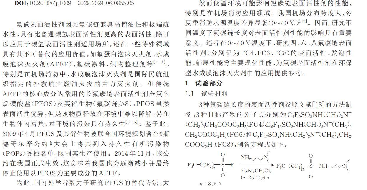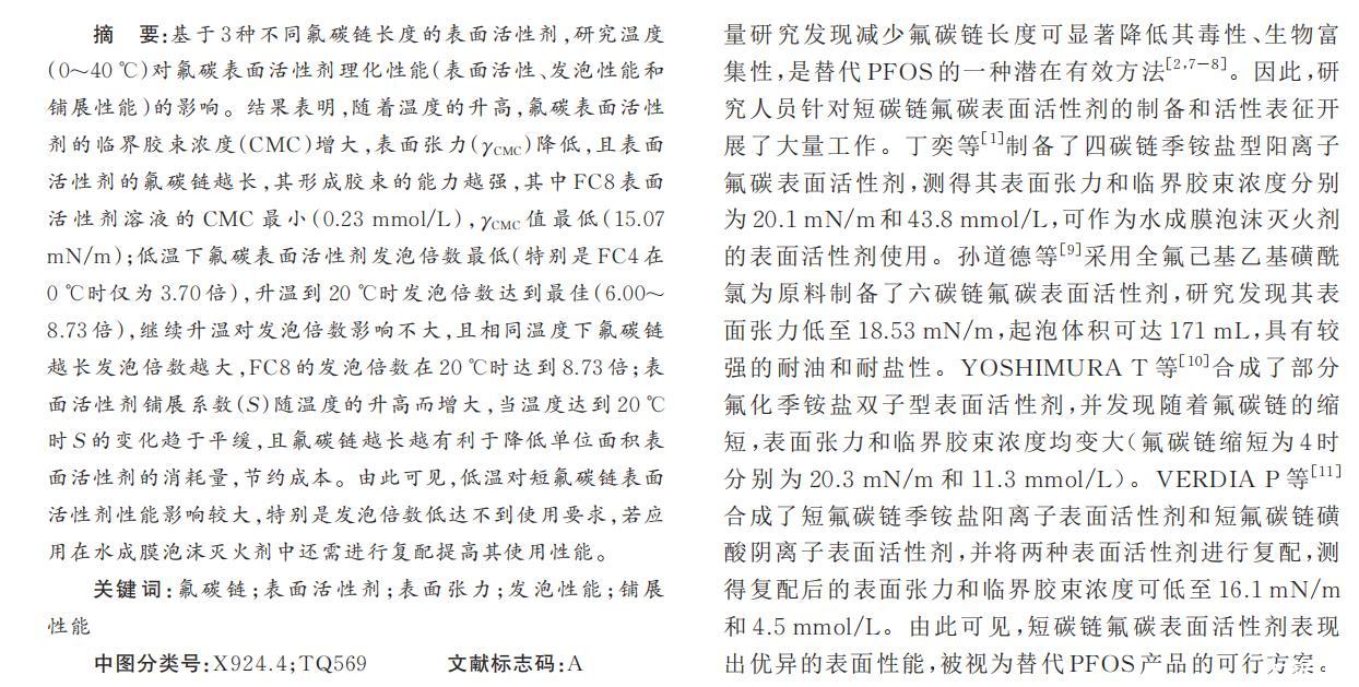 然而低温环境可能影响短碳链表面活性剂的性能,特别是在机场消防应用领域。我国机场分布跨度大,冬夏季消防水源温度差异显著(0~40℃)。因而,研究不同温度下氟碳链长度对表面活性剂性能的影响具有重要意义。笔者在0~40℃温度下,研究四、六、八氟碳链表面活性剂(分别记为FC4、FC6、FC8)的表面活性、发泡性能、铺展性能等主要理化性能,为氟碳表面活性剂在环保型水成膜泡沫灭火剂中的应用提供参考。