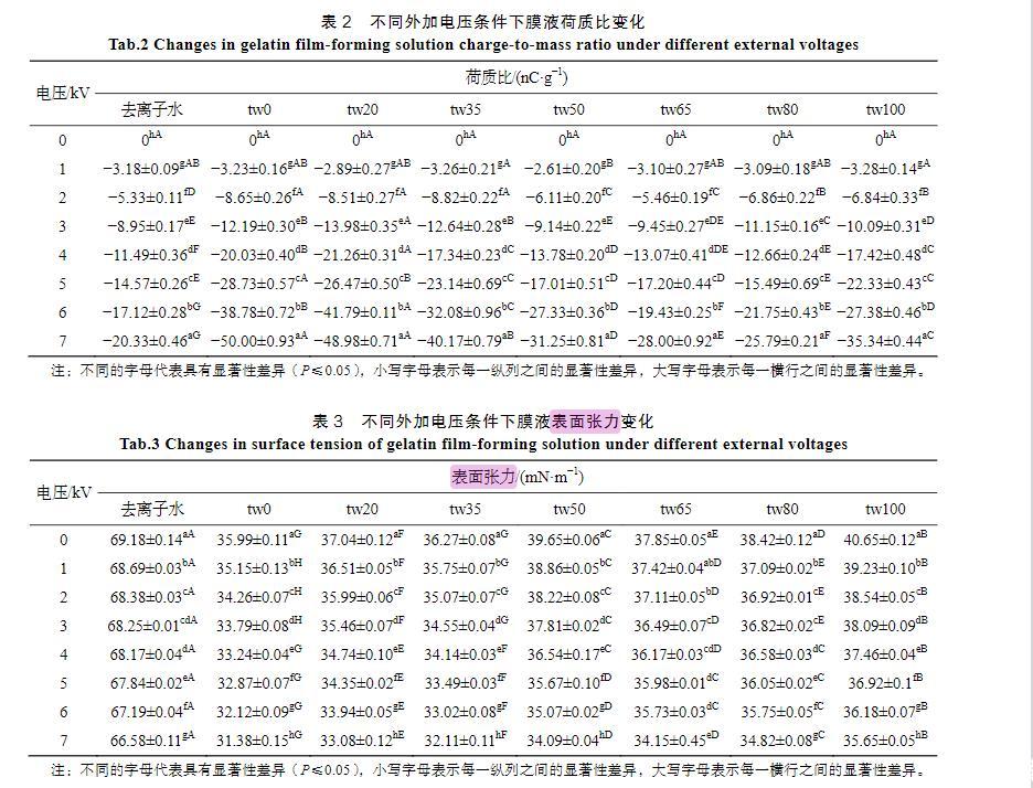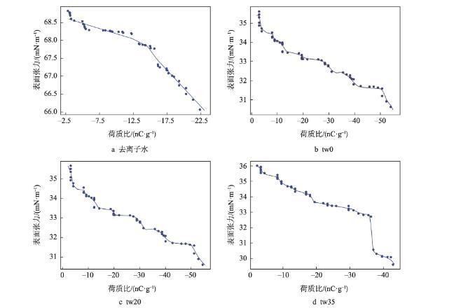随着膜液中吐温20的减少和司盘20的增多,明胶液滴荷质比亦呈增高趋势(<0.05)。张建桃等[13]研究表明,介质的电导率改变会引起其荷电性能的改变。相同质量浓度下司盘20的物质的量浓度更高,导致溶液电导率及液滴荷质比增加更为明显。然而,与只添加吐温20的明胶溶液(tw100)相比,少量司盘20的添加(tw80)还会引起荷质比的显著减少(<0.05),推测这是由于溶液中吐温20与司盘20分子通过“经典疏水作用”在水溶液中优先结合,从而使溶液中总溶质相对浓度下降导致[14]。
