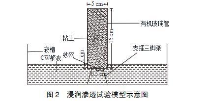 浸润渗透试验模型如图2所示,主要由液槽、支撑三脚架和透明有机玻璃管组成。有机玻璃管直径5cm,高15cm,顶端敞开,底部封闭钻有直径0.5cm的进浆孔。试验时将黏土装入有机玻璃管中,振捣压实,底部开孔处垫有纱网,防止土体掉落。将有机玻璃管和支撑三脚架放入浆液槽内,有机玻璃管底部浸入浆液液面以下1.0cm,使浆液从底部渗入黏土中,通过观察浆液在不同时间的渗透高度来评价浆液的浸润渗透效果。