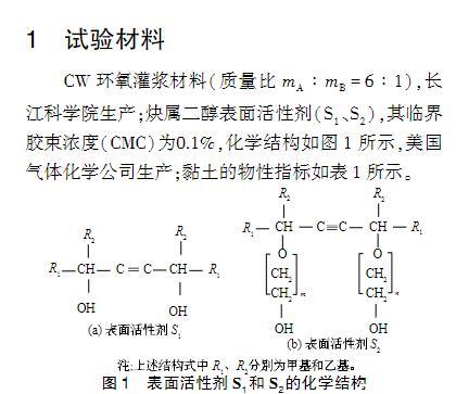 对于环氧树脂灌浆材料,加入表面活性剂对浆液的黏度、表面张力、接触角、固化物的力学性能及对被灌体的渗透性有何影响?目前这方面的的研究少见报道。而这些研究对环氧灌浆材料的开发以及灌浆施工都具有非常重要的意义。本文以长江科学院CW环氧灌浆材料为改性对象,加入非离子表面活性剂炔属二醇对其改性,研究表面活性剂对环氧浆液的黏度、表面张力、接触角、渗透性和浆液固结体力学性能的影响,在此基础上探讨了表面活性剂降低浆液表面张力、接触角以及提高浆液渗透性的机理。