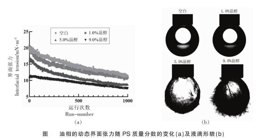 首先,将连接在毛细管上的不锈钢针(外径为1.65mm)插人盛有油相的玻璃槽内。将针尖端放置在光源和相机(CCD)之间的光学平板上。然后用自动进样单元将10μL的样品推送至针尖上并形成完整的滴形。CCD摄像系统立即持续地采集液滴的外形轮廓变化,测试时维持油相温度60℃,尽量避免外界振动的干扰。据Young-Laplace方程算出界面张力(精确至0.01mN/m)。