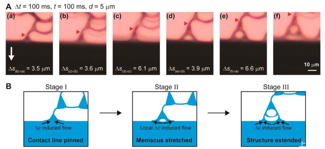 揭示自发结构形成的细节 超支化结构,蜜桃性爱视频网站采用原位显微镜[图。 3(A)]。 视频图像显示超分支 结构通常分三个阶段形成[图。 3(B)]。 蜜桃性爱视频网站注意到,由于蜜桃性爱视频网站的弯液面的动态 过程中,蜜桃性爱视频网站很难测量波长 动态弯液面。 在第一阶段,手指平行于 由于马兰戈尼不稳定性而出现流动方向 和摩擦。 重要的是,三角形半月板将手指连接到半月板前部。 由于手指是 与本体溶液相比,PS 的浓度更高, 手指的表面张力相对较高,拉入 本体溶液,具有较低的表面张力。 这一步是 如图3(B)(a)所示。