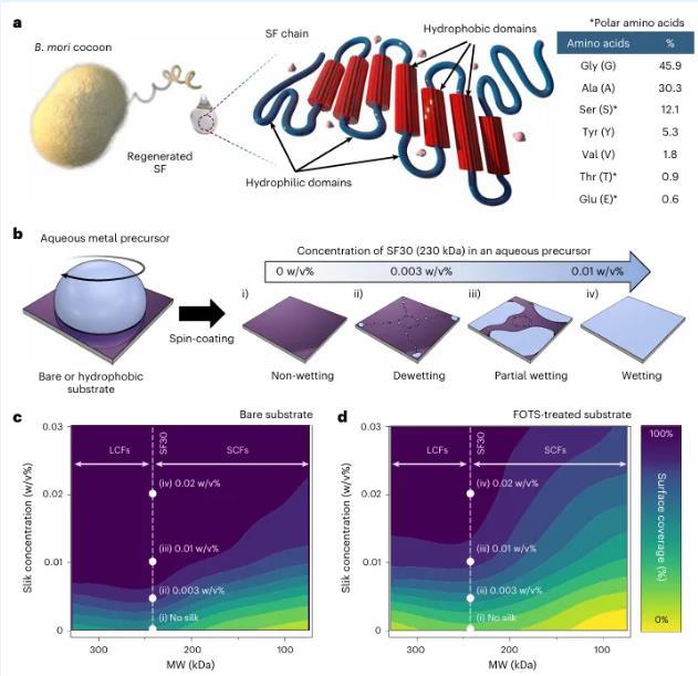图1作为天然表面活性剂的SF。b,旋转涂层金属水合物提高表面覆盖率的示意图。金属水合物溶液的表面覆盖率的示意图。c,d,添加了SF的金属水溶液的表面覆盖率(%)。的表面覆盖率(%)。基底(c)和基底上的表面覆盖率(%)。基底(d)上SF添加的金属水溶液的表面覆盖率(%)与浓度和分子量的函数关系。
