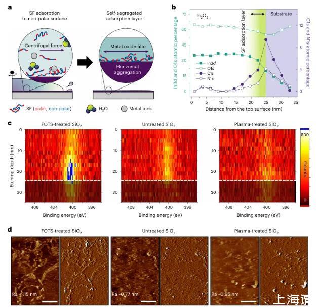 图3丝绸表面活性剂在薄膜-固体界面的自适应吸附。a,表面活性剂在涂覆过程中的自分离示意图。b,XPS深度剖面化学成分分析厚度为25纳米的In2 O3薄膜的化学成分分析。数据c,N1s在In2O3薄膜中的N1s分布。SF沉积在具有不同自由表面能的基底上的In2 O3薄膜中的N1s分布。白色虚线线表示与二氧化硅d,通过选择性蚀刻金属氧化物获得的埋藏SF层的高度和偏转AFM图,通过选择性蚀刻金属氧化物获得(比例尺,1µm;Ra,平均值;Ra,算术平均粗糙度)。