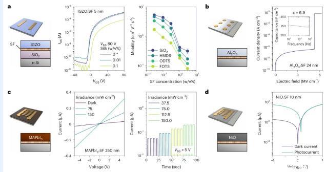 图4使用丝表面活性剂的水激活纳米器件。基于IGZO:SF的场效应晶体管(FET)。中间:用不同的晶体管的转移曲线。右图:不同SF晶体管的电荷迁移率。数据点和误差条显示平均值±s.d.(样本数为3)。以及制备的MAPbI3的薄膜的I-V特性。d,基于NiO:SF的光电探测器的结构(左)和在不同侧向电压(中)和时间(右)下的光探测器的结构(左)及其在白光照明下的I-V特性(右)。(右图)。所有器件都是在疏水性基底上制造的SF基绝缘体的结构(左)及其电流密度-电场曲线。