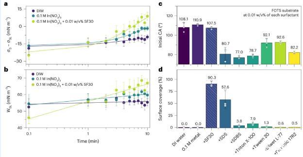 图2利用丝表面活性剂进行高效的界面能控制。水溶液中SF在水溶液中的界面张力(a)和粘附功(b)的随时间变化。(d)与其他商用和最先进表面活性剂的比较。表面活性剂。在a和b中,数据点和误差条表示平均值±标准偏差(s.d.标准偏差(s.d.)(样本量为4),直线表示线性回归。在c和d中,点表示数据点。色条和误差条显示平均值±标准差(样本量3)