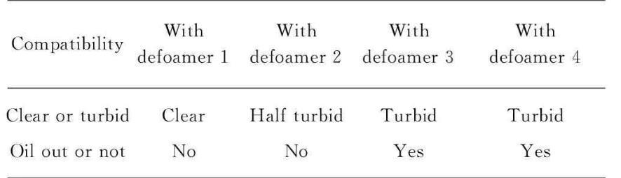 消泡剂的消泡能力与乳液的相容性成反比关系。消泡剂1和2与乳液的相容性最好,但因为部分溶解于乳液中,使消泡强度减弱;而消泡剂4与乳液的相容性最差,虽然具有极强的消泡性,但是因为过于疏水而难与乳液相容,所以容易造成表面缺陷。消泡剂3与乳液的相容性与消泡能力较为平衡,是最佳的消泡剂选择。