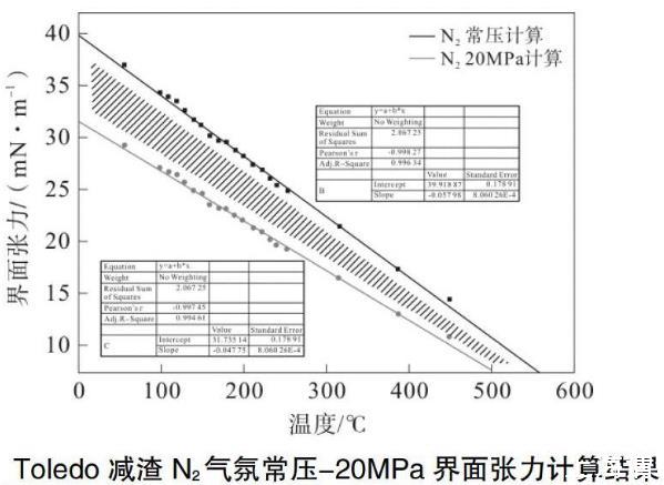 不同温度条件下的线性下降的斜率与温度的变化也基本呈现出一定的的线性。另外,对于不同压力下的界面张力-温度关系,理论上应当都是线性变化,因此,斜率变化的线性变化规律也是符合一般规律的。由此可以推测得到在相应温度条件下的线性下降斜率,从而由N2常压条件下Toledo减渣的界面张力推测得到N2在20 MPa气氛条件下Toledo减渣的界面张力。