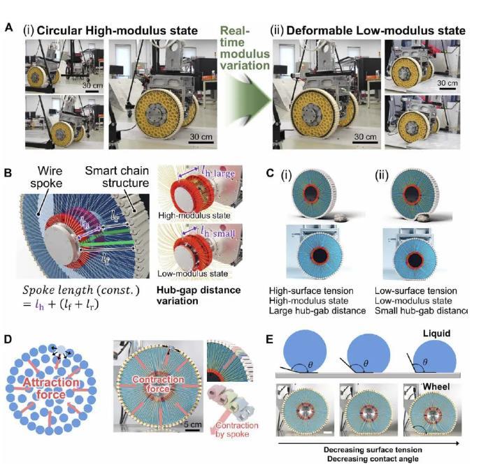 2.可变刚度机制:通过改变连接到轮子最外层智能链块(smart chain block)的牵引力(即改变牵引线张力),来控制轮子的形状和刚度。