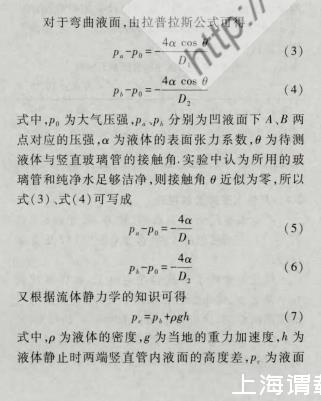 根据式(8),只需测量两竖直管的直径D1、D2以及管中凹液面的高低差h,便可以计算出待测液体的表面张力系数。