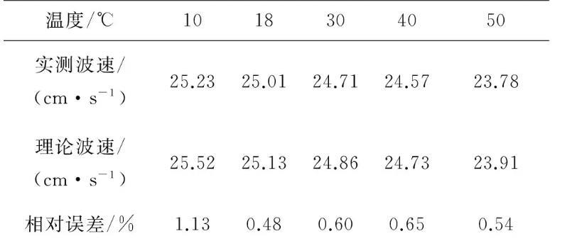 将之前得到的多组表面张力系数和波长数据代入式(1)中计算理论波速,再与实验中的实测波速作比较,便可以通过实验验证水波波速与其表面张力关系公式的的正确性。在不同温度下,实际测得的波速、由原理公式计算出的理论波速以及两者的相对误差数据列于表5。