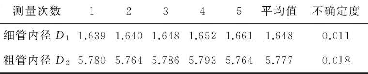 在组装不等径U型管之前,用读数显微镜分别测量两支玻璃管的内径,取5次测量的平均值,记为D1、D2.测量数据列于表1.