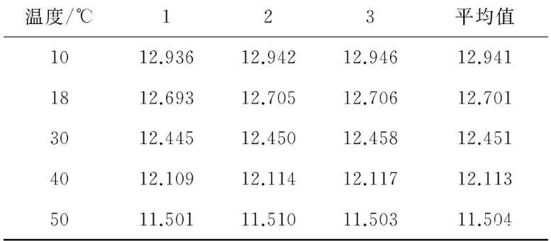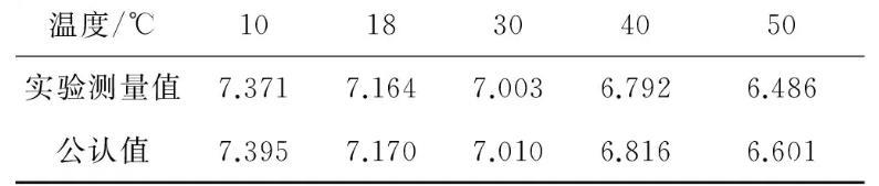 将不等径U型管内径以及液位差的测量数据代入式(8)中,计算得到对应温度下的表面张力系数的测量值。查阅已有文献,可以得到不同温度下纯净水表面张力系数的公认值以及数据拟合出的公式α=75.45067-0.13326t-5.26468×10-4t2.实验测量值与公认值对比列于表3.