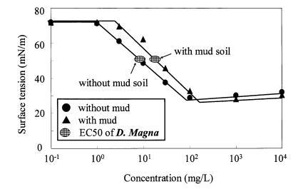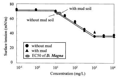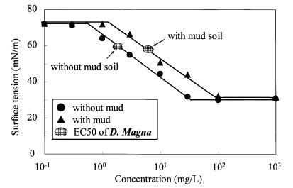图 11 泥土存在对地表的影响 LAS 和有毒表面张力的张力曲线 Daphnia Magna 的价值。