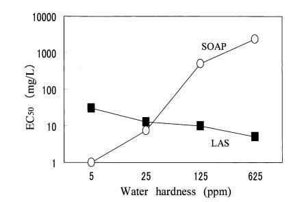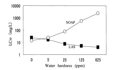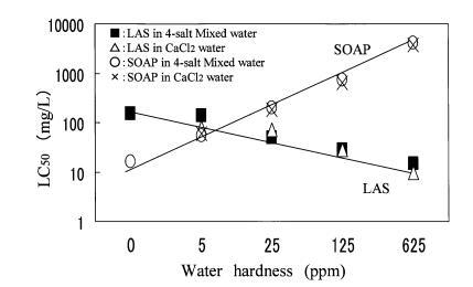 图 4 水硬度对急性毒性的影响 LAS 和 SOAP 到 4-盐混合中的 Orysis Latipes 水。