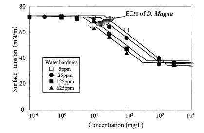 图 9 水硬度对表面张力的影响 烷基硫酸盐和有毒表面张力曲线 Daphnia Magna 的价值。